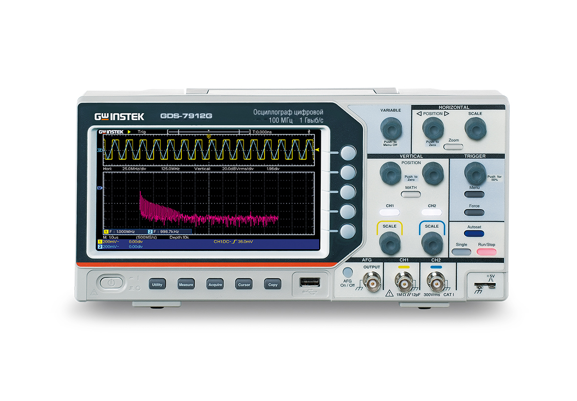 | Особенности | Макс. частота дискретизации 1 ГГц/кан на длине записи 1000 точек. Автоизмерения (30 параметров), курсорные измерения, функции математики - сложение, вычитание, умножение, деление. Режимы сбора данных - выборка, пиковый детектор (>2,5 нс), усреднение (4 … 128), ZOOM (растяжка). Частотный анализ (БПФ) на участке 2048 точек (с.к.з./ дБ). Внутренняя память 16 осциллограмм, 8 профилей настроек, 6-разрядный частотомер |