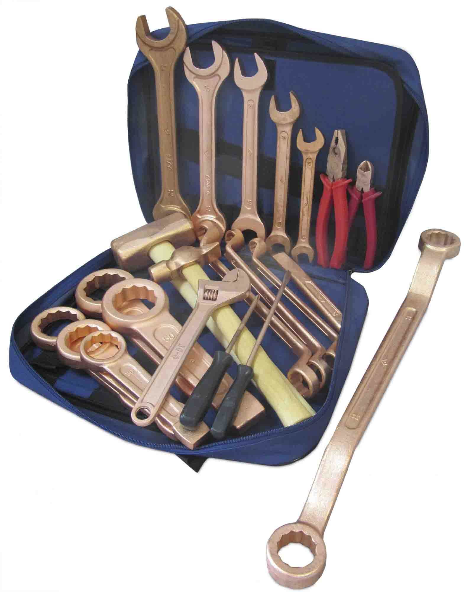 Комплект искробезопасного инструмента предназначен для проведения слесарно-монтажных работ, который не дает искр при ударах, трениях, падении, срывах и т.д. Инструмент покрыт медью толщиной 50 мкм.